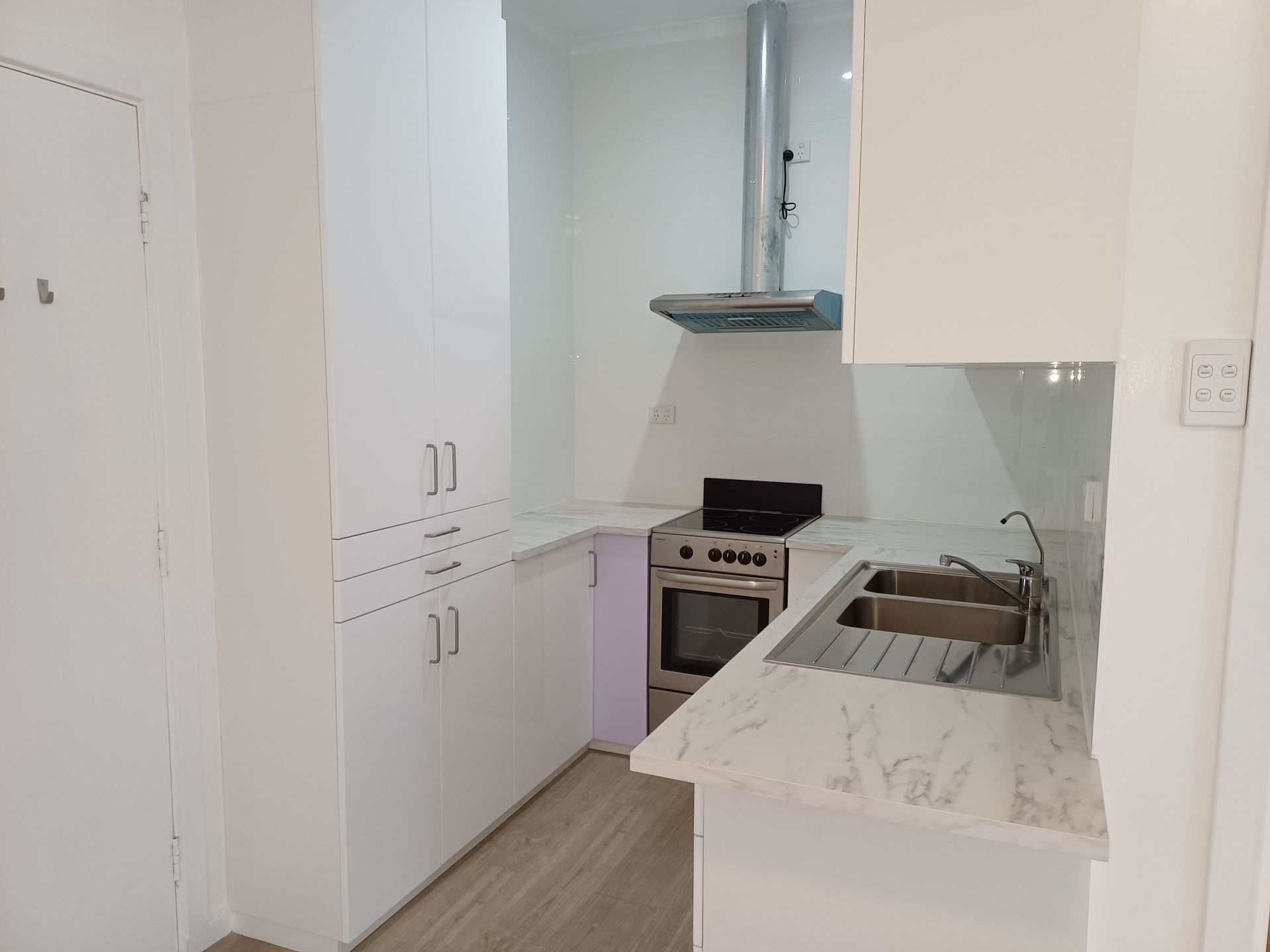 * Kitchen with stainless steel oven and cook top